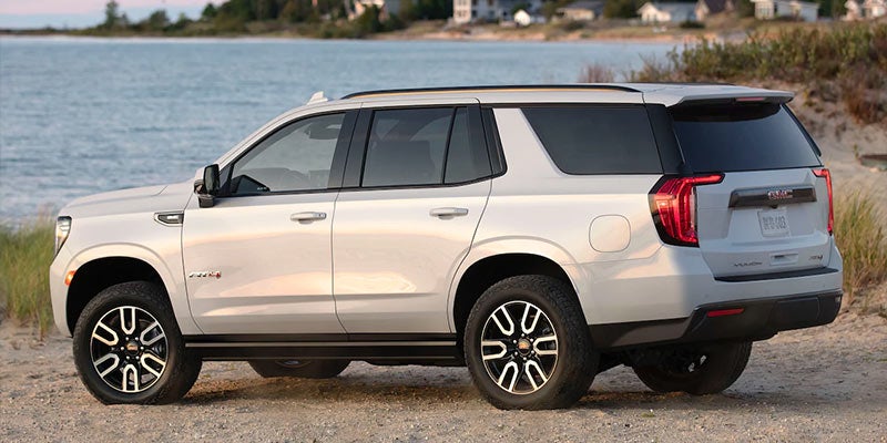 The 2021 Yukon is available in four trim packages, including the SLE, SLT, AT4, and Denali. All trims include heated exterior mirrors, assist steps, roof-mounted side rails, deep-tinted glass, automatic LED headlights, daytime running lights, fog lights, rain-sensing wipers, and an acoustic laminated windshield. Except for the base SLE, all models also include a hands-free power liftgate. The top-of-the-line Denali includes unique chrome accents and a steel-tipped dual exhaust. The off-road AT4 has a unique front-end design, skid plates, and red recovery hooks.