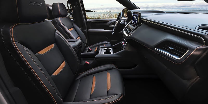 All models include a leather-wrapped steering wheel and tri-zone automatic climate control. Except for the SLE, all models include heated and ventilated front seats, heated second-row seats, and leather upholstery. The second and third rows are 60/40 split flat-folding benches. With all seats occupied, the 2021 Yukon provides 25.5 cubic feet of cargo space, with a maximum cargo volume of 144.7 cubic feet behind the first row. Available interior comfort features include a power-sliding center console and a panoramic sunroof.